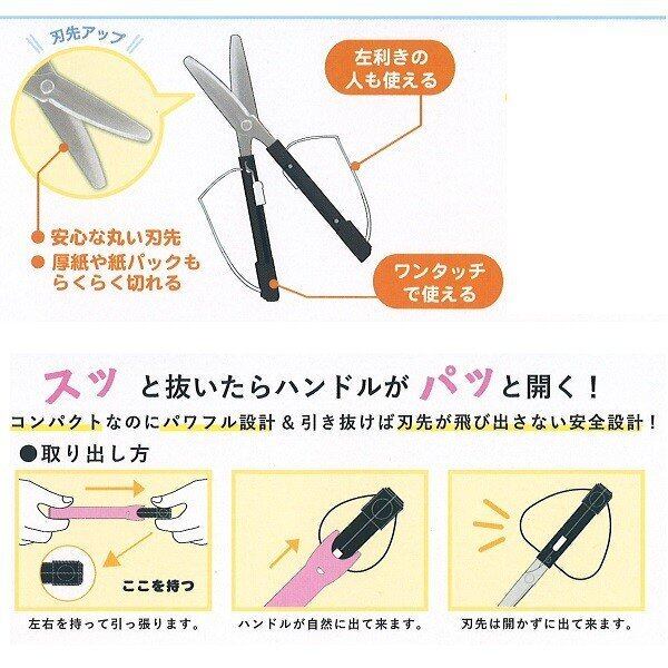 スッと抜いたらハンドルがパッと開く コンパクトなのにパワフル設計の はさみです。