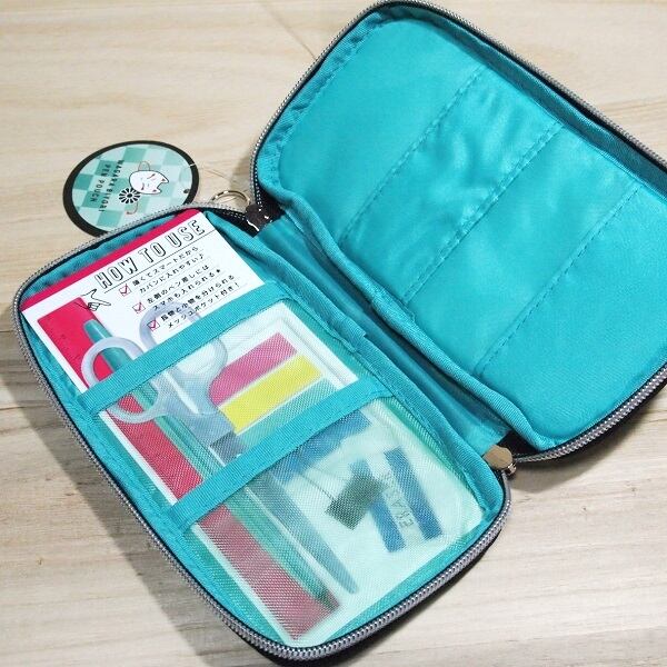 中はペン差し部分とメッシュポケットあり。フラットコンパクトで持ち運びに便利。