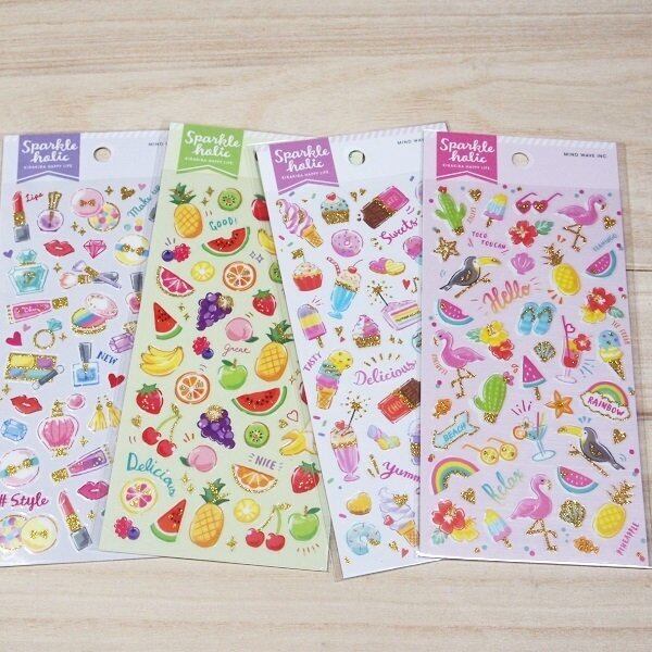フルーツ、コスメ柄、パーティー、トラベルなど、見ているだけで楽しくなるシールです。